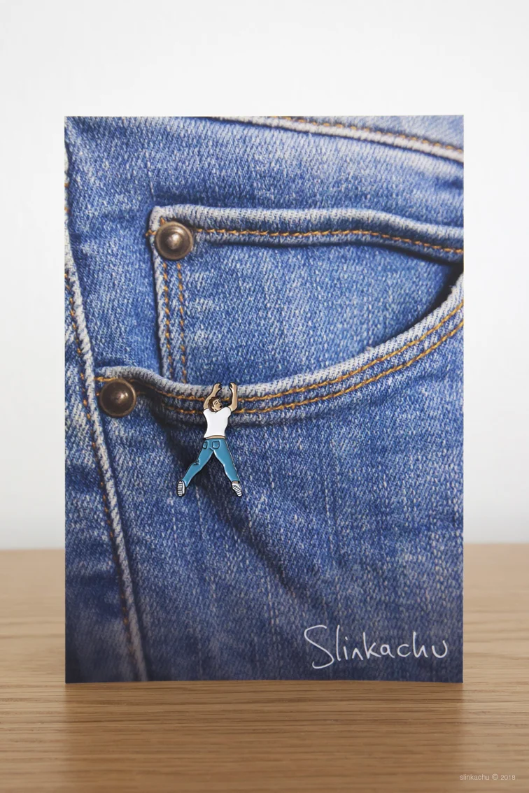 My first pin has just been released! Now is your chance to own your own little person, designed to interact with your clothes! Pin him to your shirt pocket and watch as he clings helplessly to your boob! Pin him on your briefs and laugh as he precariously hangs from your junk! Or perhaps pin him to your bag and cross an international border, thus making you a trafficker of little people and him an illegal immigrant! There is no end to the places you can pin this desperate little man!